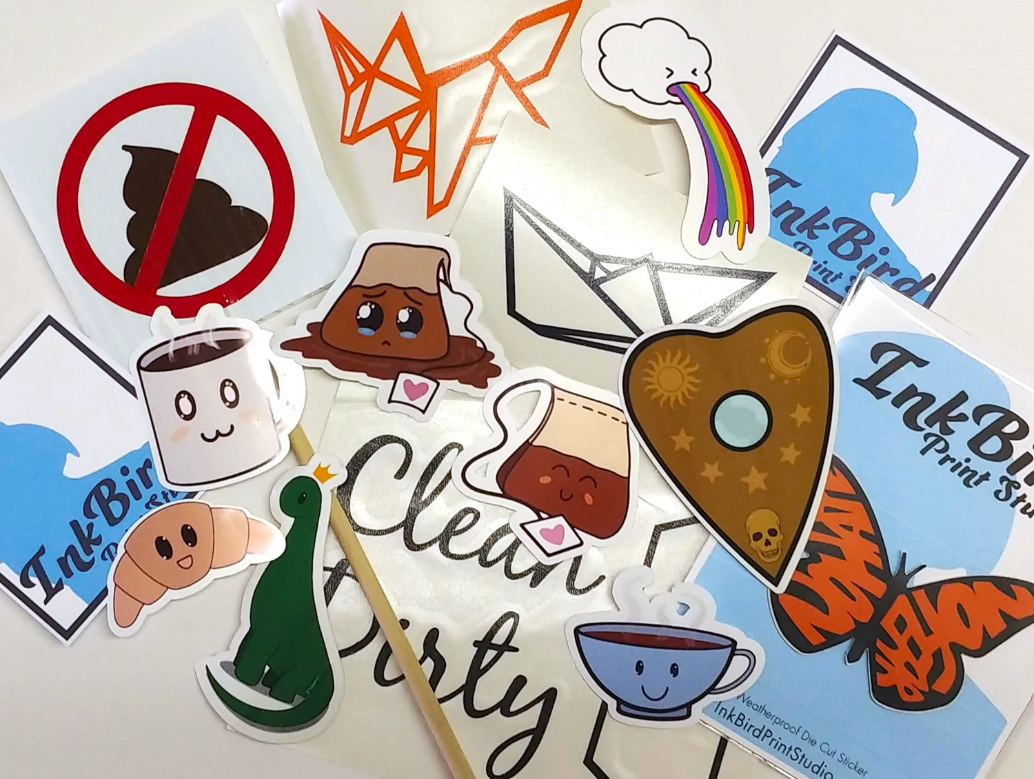 Weatherproof, durable stickers with a 5-7 year lifespan, available in custom shapes and sizes. Use these for bands, businesses, and promotions.