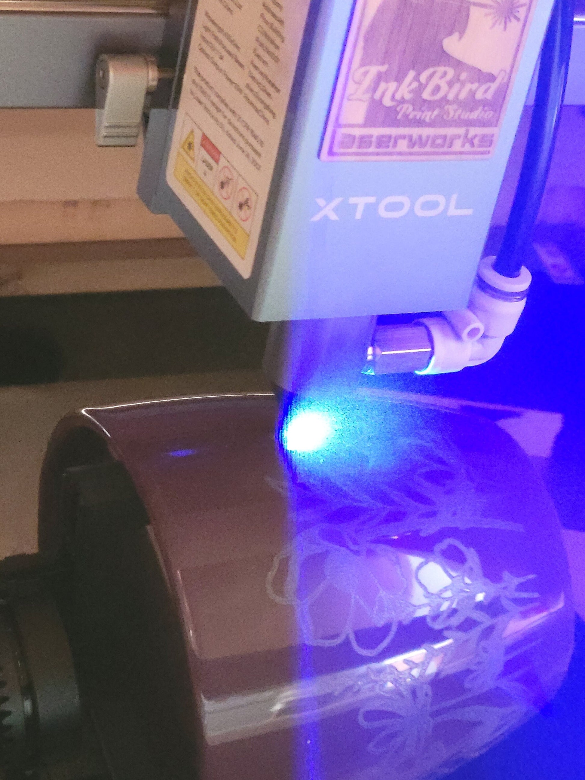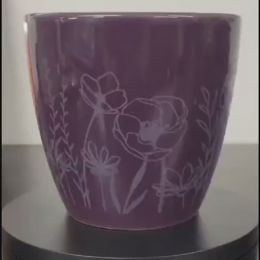 These pots were found at a thrift store, cleaned up, and then laser etched with a botanical outline design that encompasses the entire pot. After etching, we take our pieces to a wire wheel to smooth them out and give them a soft, touchable surface.